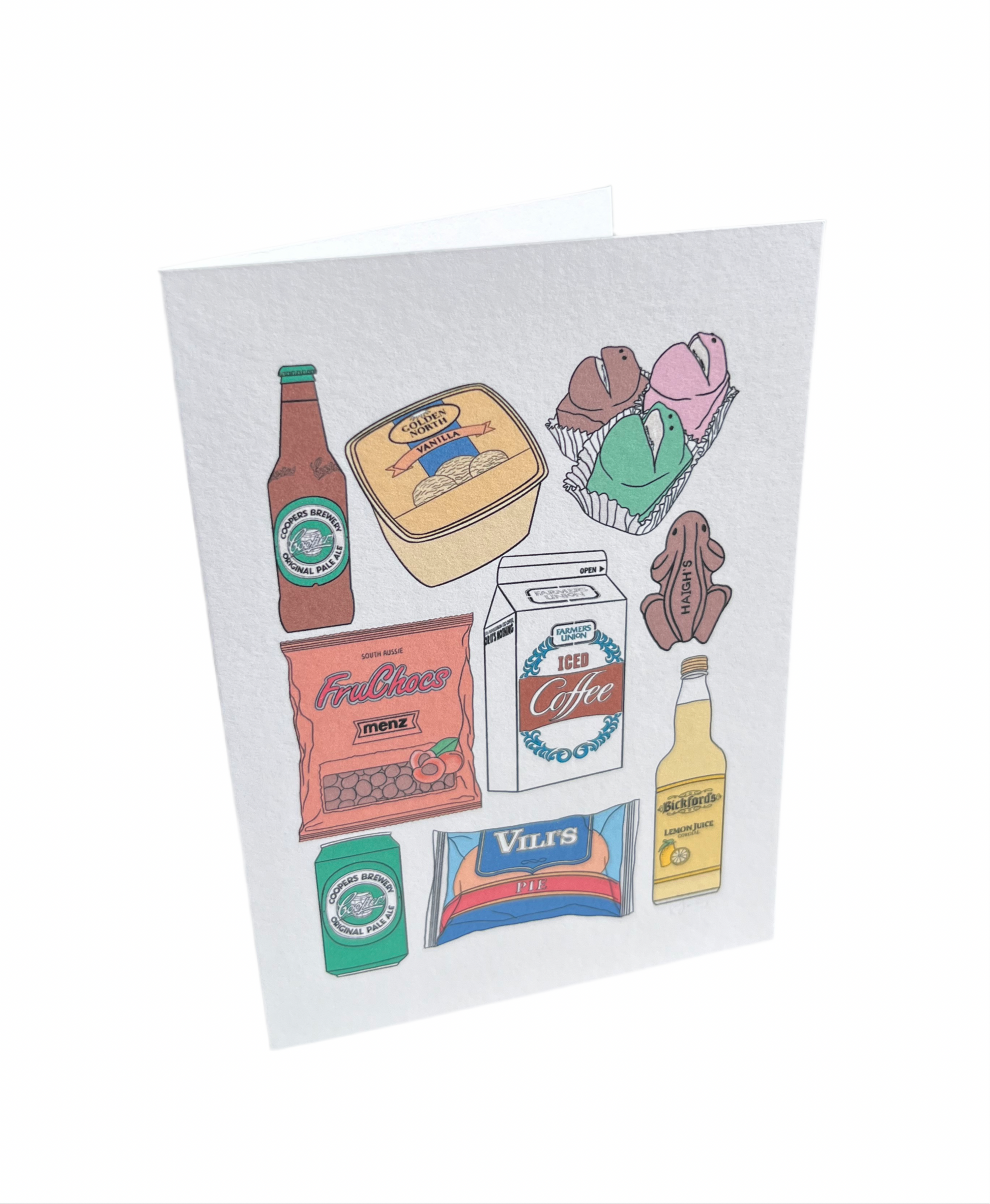 From pies, frogs, choccies and beers, this card features all our fave local treats and would the perfect gift for the South Aussie foodie! Cards are blank on the inside.