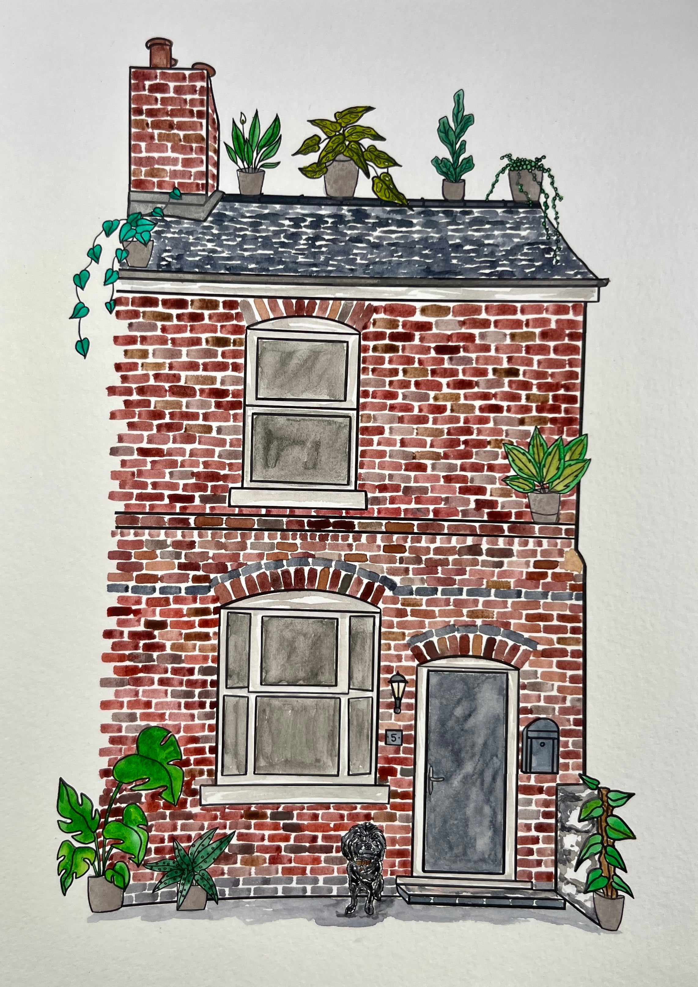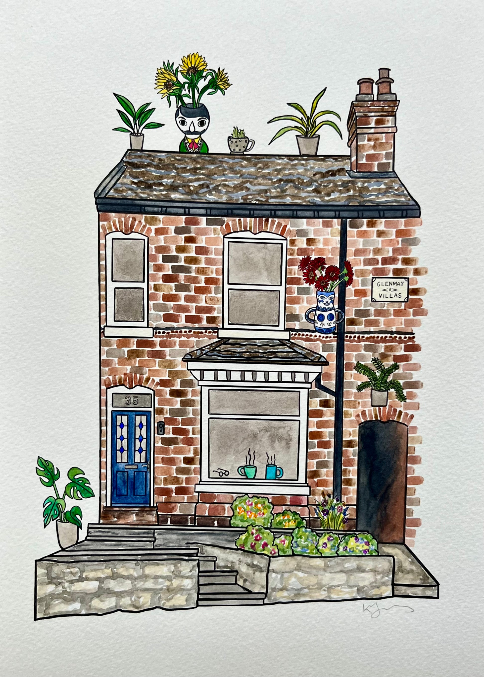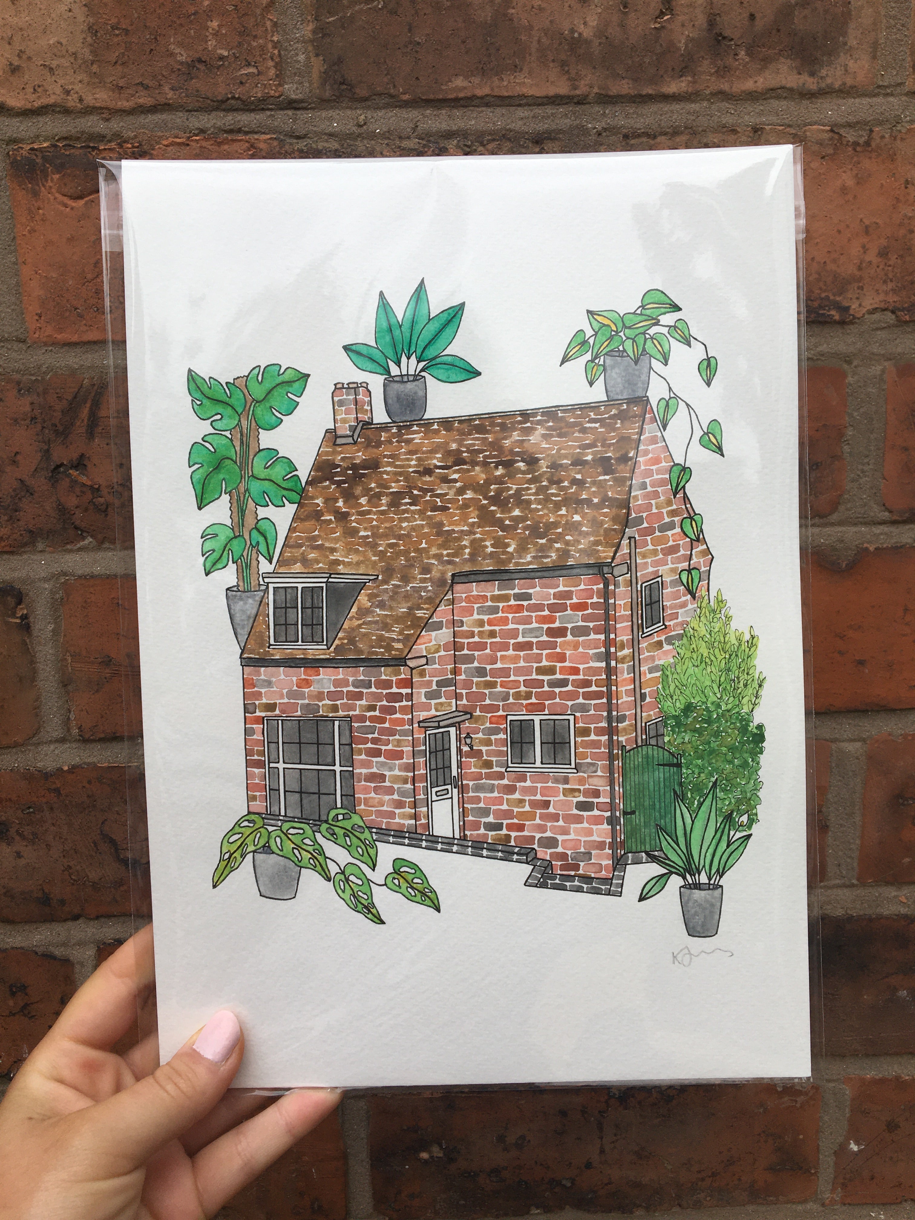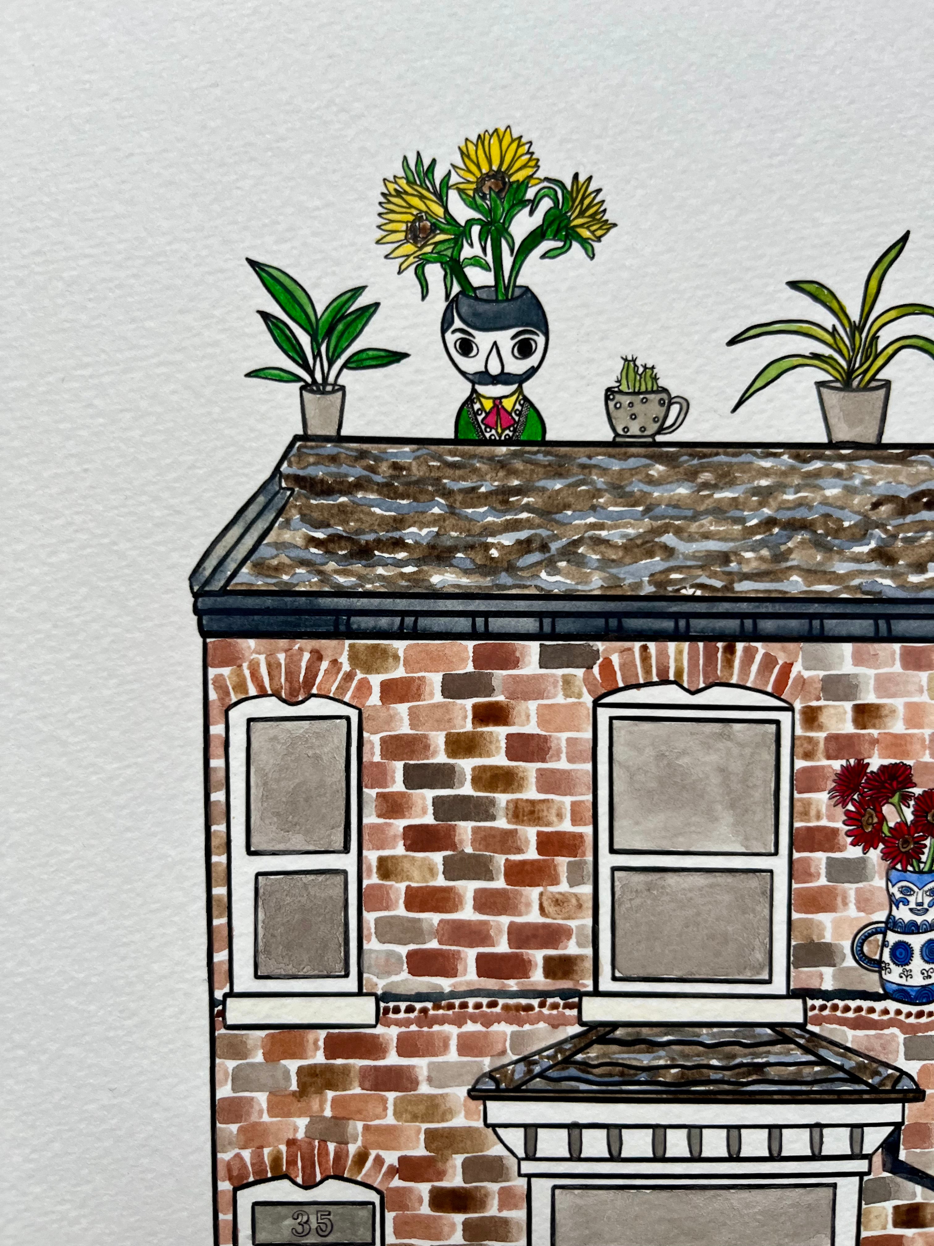 All homes are available with or without plants in my Crafty Brum style in A4. The pieces are hand drawn and painted with a watercolour finish.