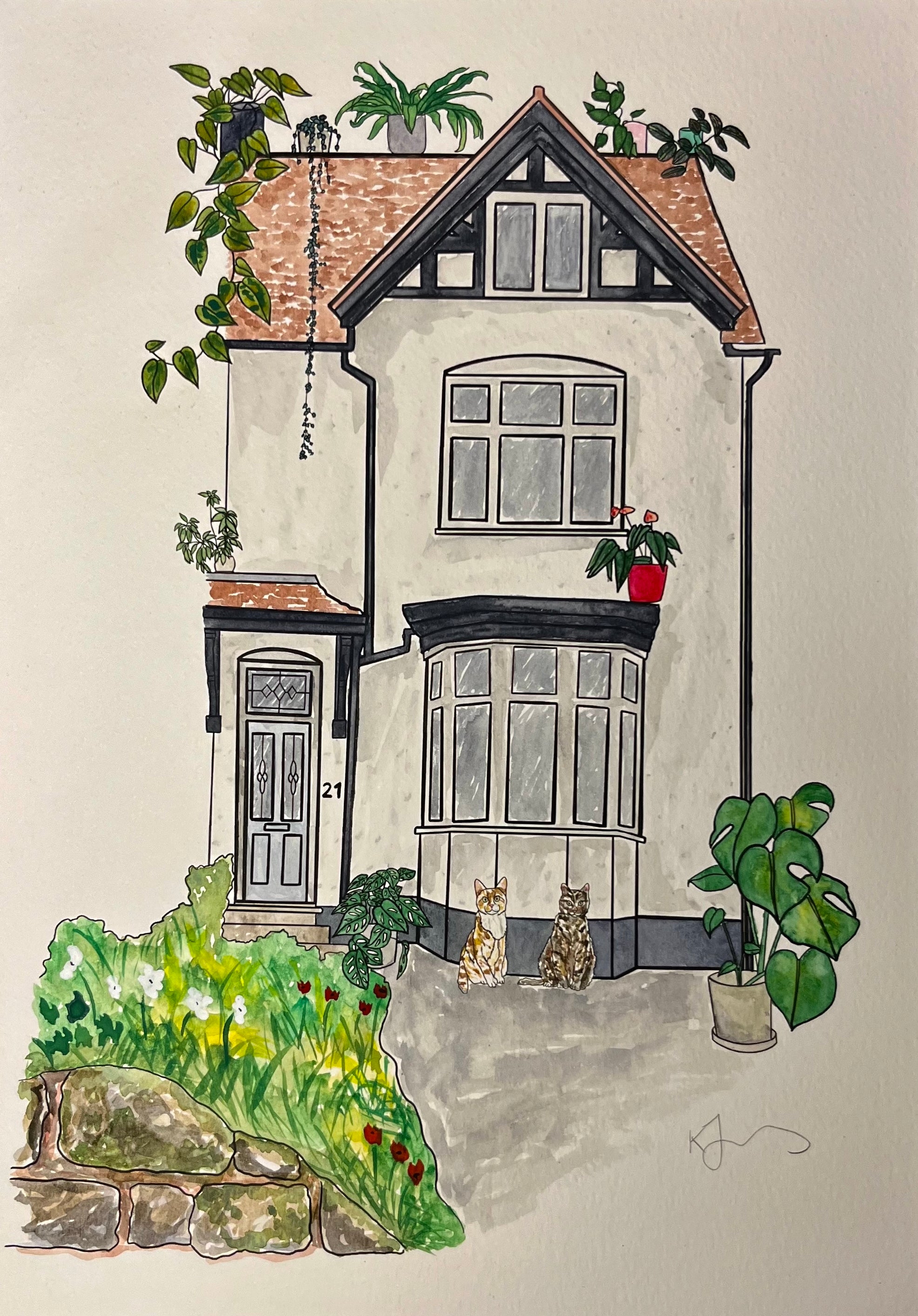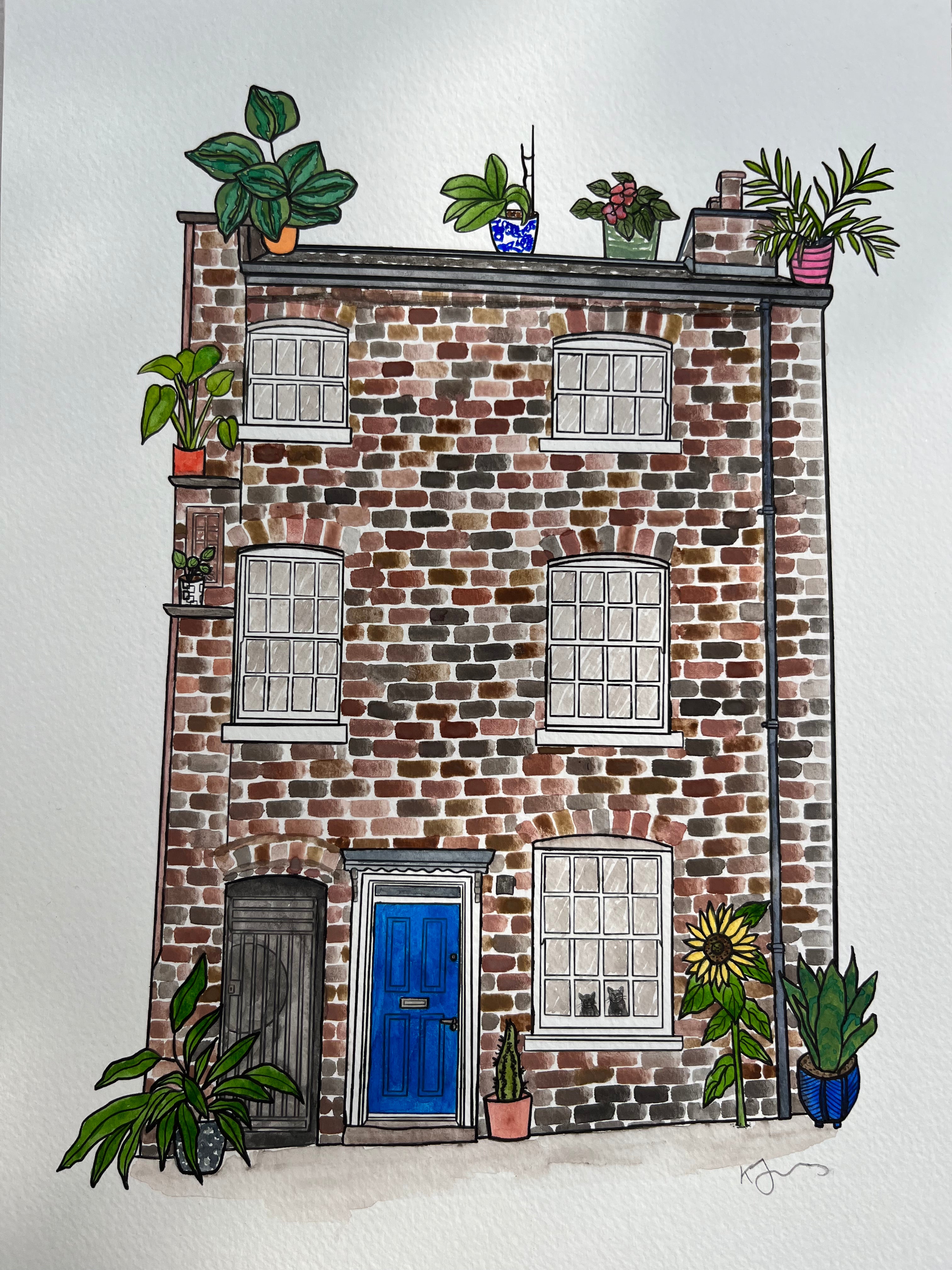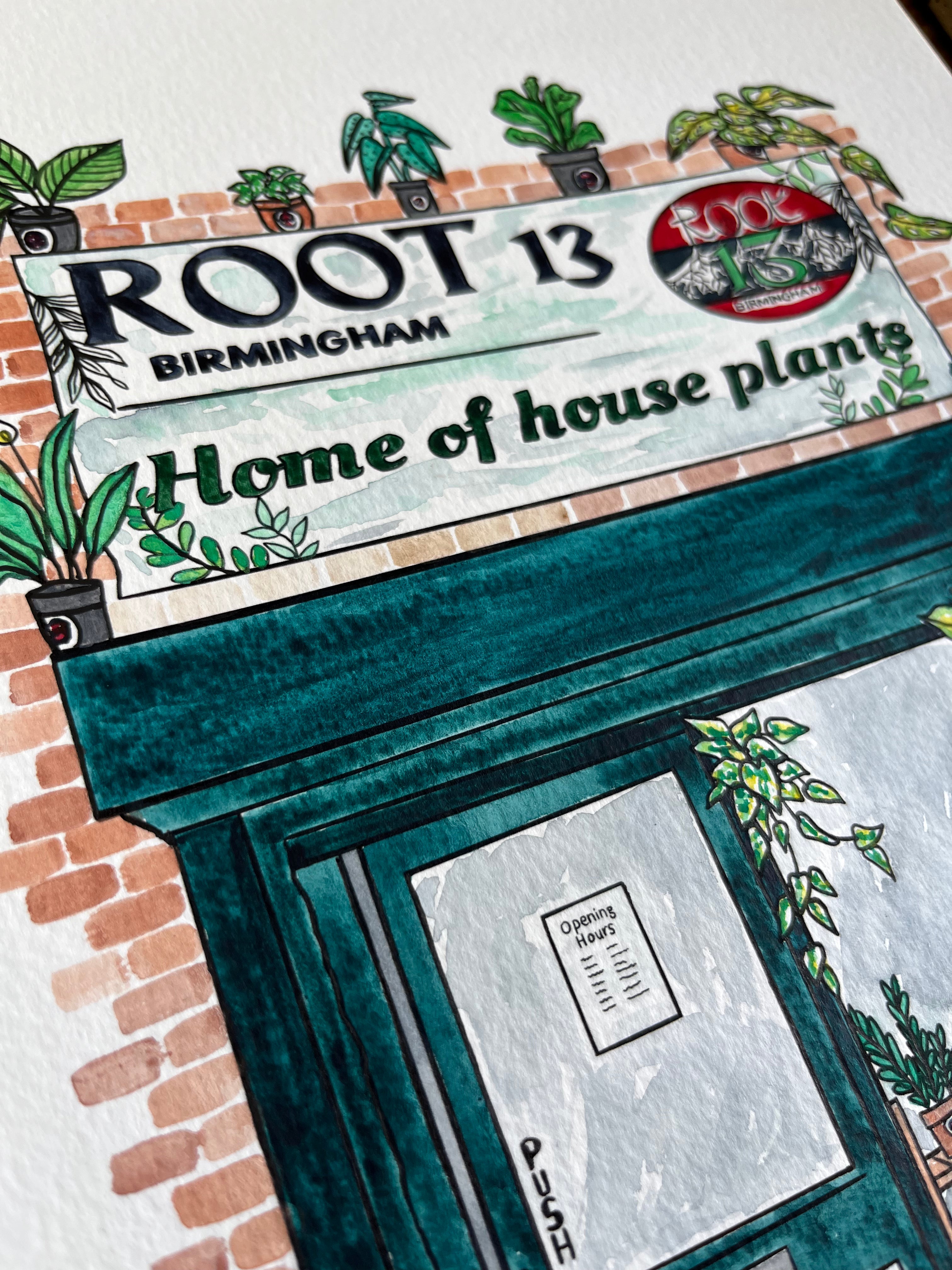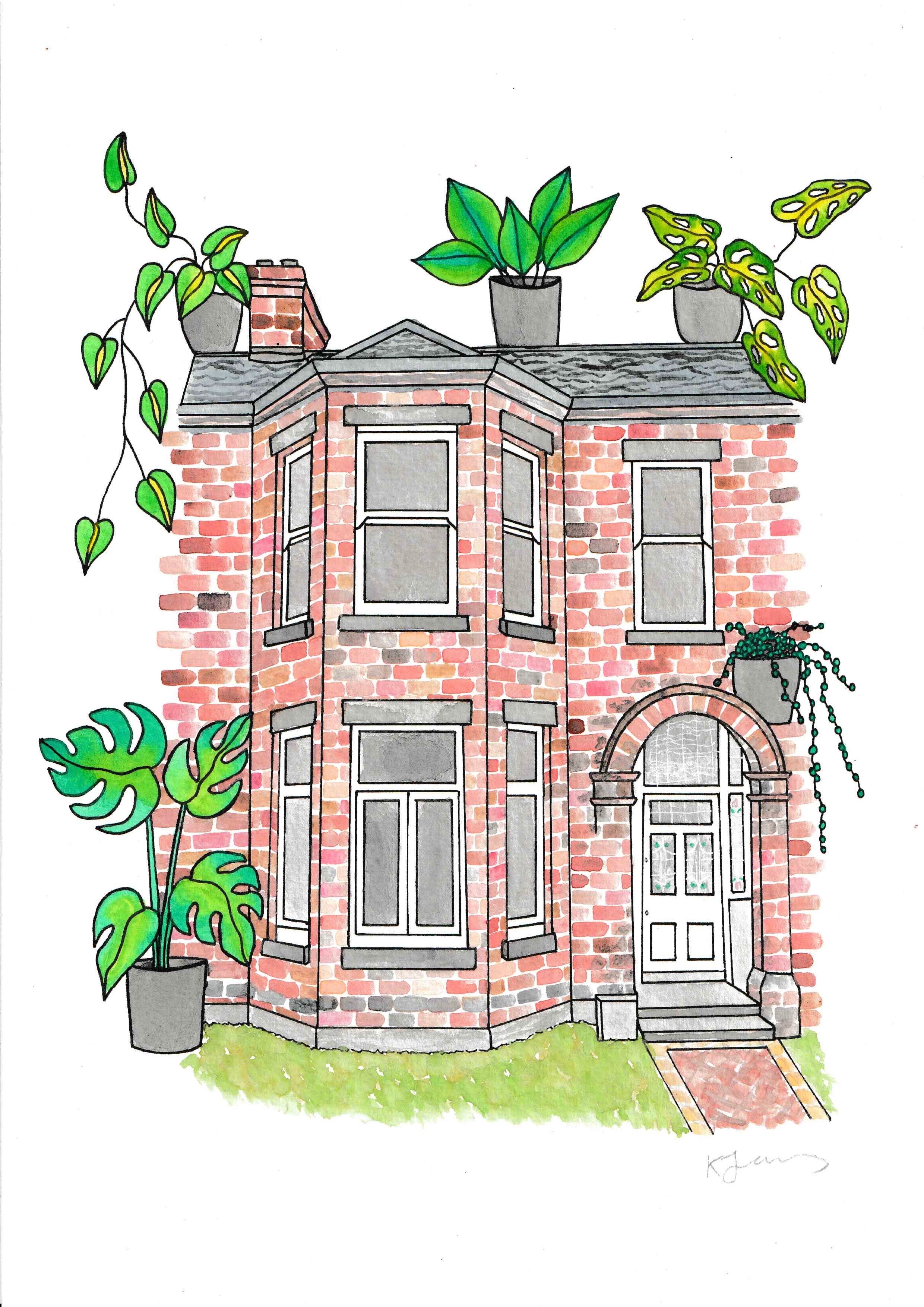 All homes are available with or without plants in my Crafty Brum style in A4. The pieces are hand drawn and painted with a watercolour finish.